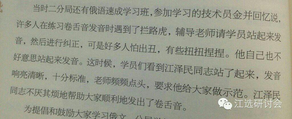 55年,江被派往莫斯科,「在那里,江只要一有机会就练习俄语——在正式会议上,在与陌生人的邂逅中——他从来不觉得有什么不自在,他还鼓励那些沉默寡言的同事以他为榜样。」文革初,他为热工所技术人员组织讲座和课程,其中就有用俄语授课。95年访俄,江在专场音乐会上用俄语深情朗诵起西蒙诺夫的诗《等着吧,我会回来》。